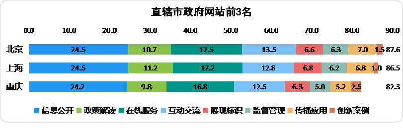 直辖市政府门户网站中,北京、上海和重庆位列前三名,得分如下: