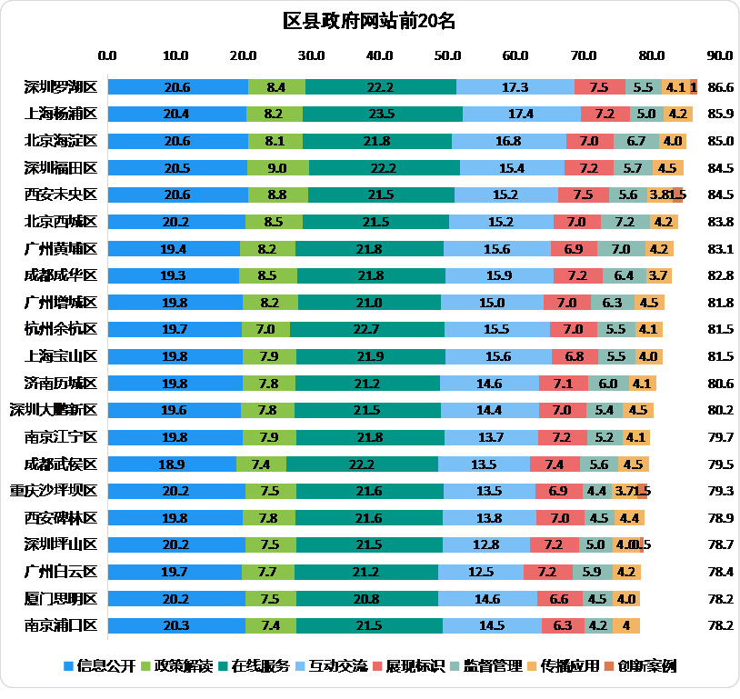 本次区县政府网站的评估范围是直辖市和副省级城市所辖区县。其中,深圳罗湖区、上海杨浦区、北京海淀区位列前三名,深圳福田区和西安未央区并列第四名,北京西城区、广州黄埔区、成都成华区、广州增城区、杭州余杭区/上海宝山区位列六至十名,济南历城区、深圳大鹏新区、南京江宁区、成都武侯区、重庆沙坪坝区、西安碑林区、深圳坪山区、广州白云区、厦门思明区/南京浦口区分列十二至二十名。得分如下: