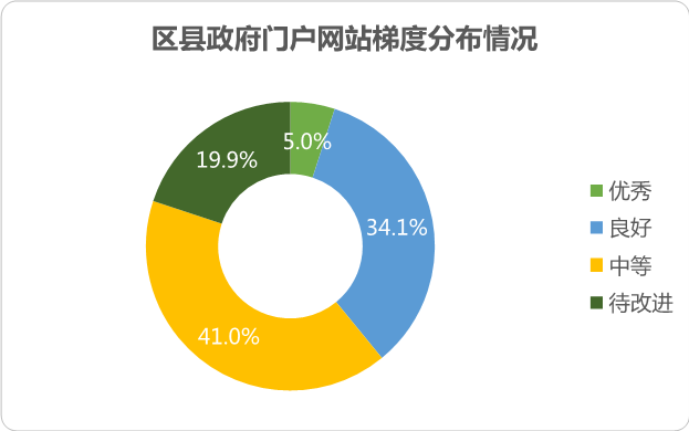 区县级政府门户网站中,13家网站位于“优秀”梯度,89家位于“良好”梯度。区县级政府门户网站梯度分布情况如下: