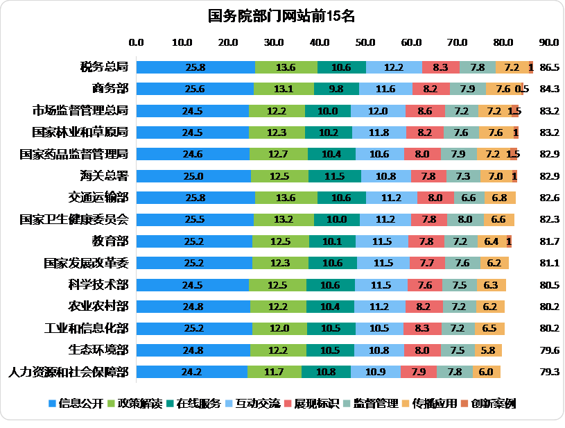 部委网站中,税务总局和商务部位列前两名,市场监督管理总局和国家林业和草原局并列第三名,国家药品监督管理局和海关总署并列第五名,交通运输部、国家卫生健康委员会、教育部、国家发展改革委、科学技术部、农业农村部/工业和信息化部、生态环境部、人力资源和社会保障部分列七至十五名。得分如下: