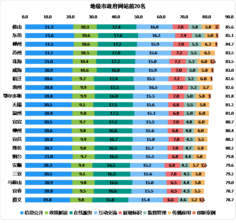 地级市政府门户网站中,佛山、东莞、郴州位列前三名,苏州/珠海、威海、宿迁/惠州、鄂尔多斯和无锡分列四至十名,温州、宜宾、柳州、宜昌/潍坊、烟台、安顺、三亚、马鞍山、宜春/遵义位列十一至二十名。得分如下: