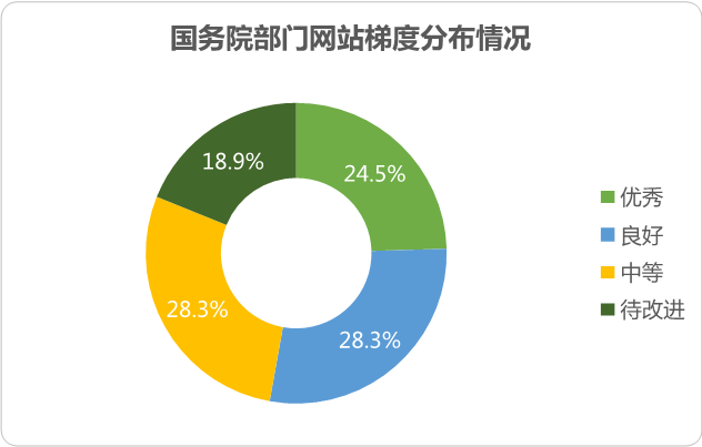 国务院部门网站中,13家网站位于“优秀”梯度,15家位于“良好”梯度。国务院部门网站梯度分布情况如下:
