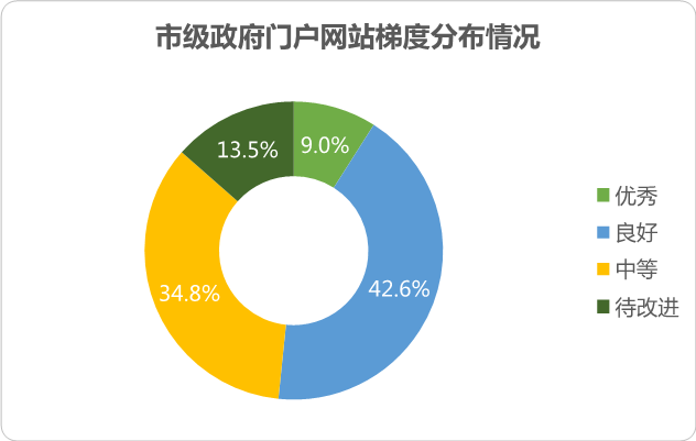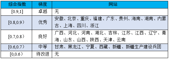 2021年中国政府网站绩效评估中,根据各网站的综合指数得分,将其划分为5个层级,并分别用“卓越、优秀、良好、中等、待改进”进行标识。