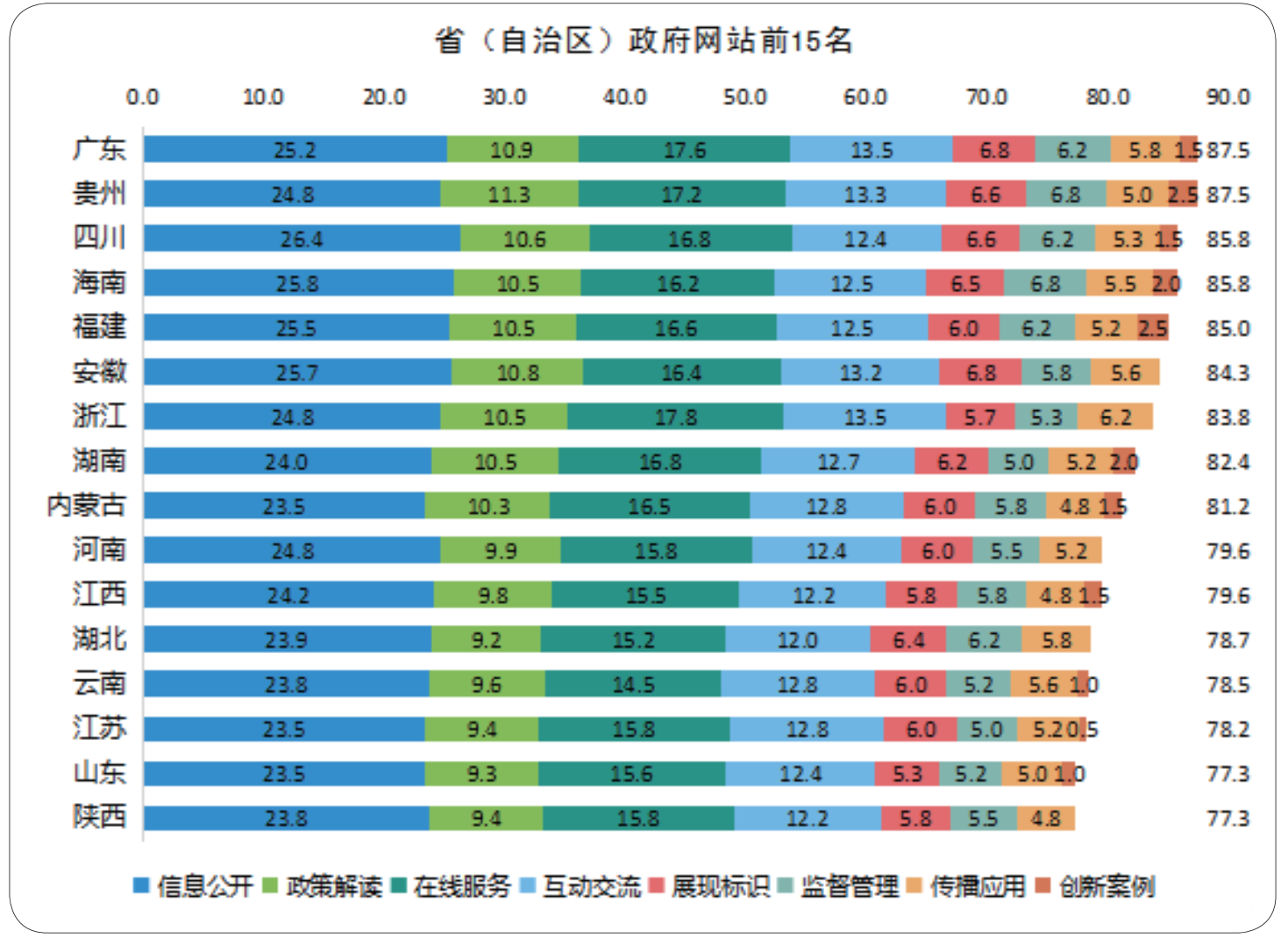 省(自治区)政府门户网站中,广东和贵州并列第一名,四川和海南并列第三名,福建、安徽、浙江、湖南、内蒙古、河南/江西分列五至十名,湖北、云南、江苏、山东/陕西分列十二至十五名。得分如下: