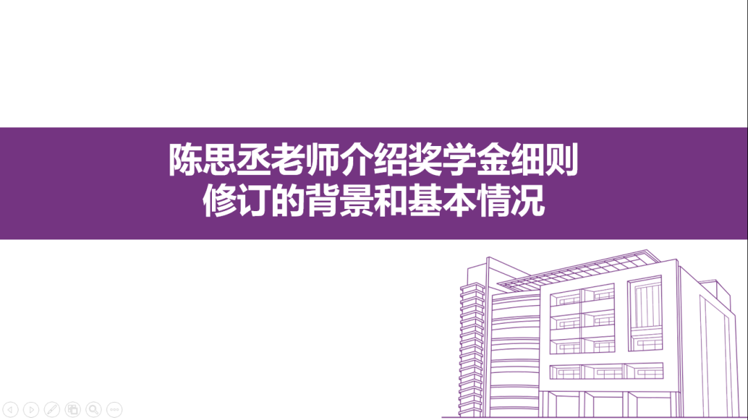 活动伊始,陈思丞老师向大家介绍了此次奖学金评定细则修订的背景。为贯彻落实PP电子2030高层次人才培养方案,持续完善高层次创新人才培养模式和研究生分类培养体系,全面推进教育评价改革,突出创新质量和贡献的评价导向,学校研工部于本学期下发通知,要求各院系进一步规范奖学金评定流程,修订奖学金评定细则,特别要求建立体育、美育、劳育的合理化评价机制,细化各项评定原则,探索建立劳动清单制度。