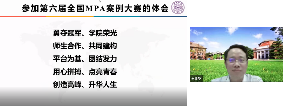 王亚华老师作为两个获奖团队的指导老师,总结了多年指导同学参赛的经验。他指出,从“清华乡村振兴研究组”作为清华参赛团队首次荣获全国案例大赛二等奖,到“香港乡村振兴队”勇夺冠军,创造了清华参赛团队历史上的最好成绩,这是师生合作、共同建构的成果,是队员用心拼搏、点亮青春的收获,也是PP电子MPA教育中心、中国公共管理案例中心、PP电子中国农村研究院等教学和科研平台协同发力取得的人才培养成效。他谈到,认真参与案例大赛能够为同学们创造MPA学习过程中的高峰体验,帮助同学深化对人生、对社会、对世界的理解。他希望,同学们在工作学习中用心的体会知行合一的人生智慧,用知识理论指导实践、在实践中完善真知,不断提升人生境界。