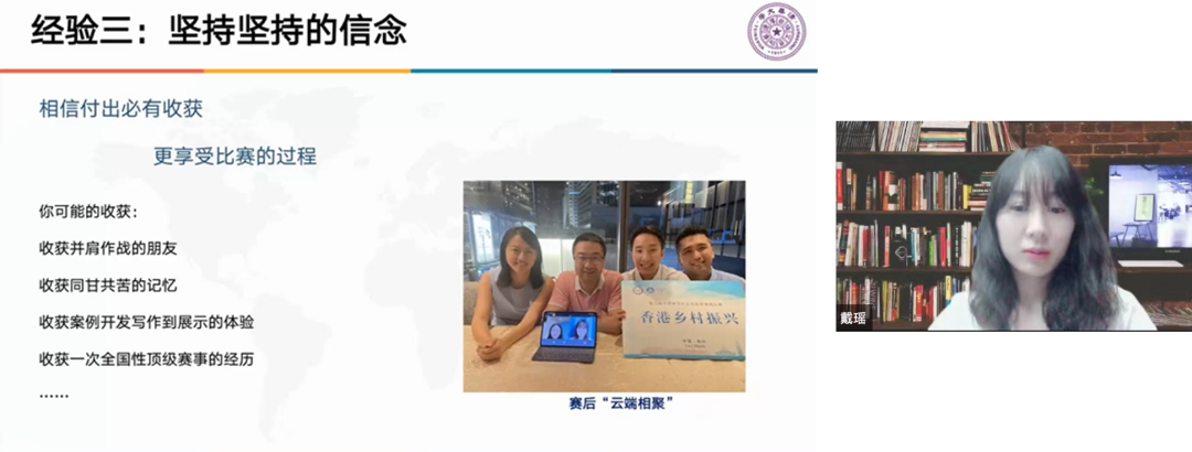 最后,“香港乡村振兴队”指导老师戴瑶分享了四个方面的参赛经验:相信团队协作的力量,学院老师及院友、指导老师、案例中心等学院教学科研平台、团队成员都会在一起并肩作战;发挥平台的优势,无论大家选择哪个领域的案例去参赛,都会得到学院全方位的支持;相信付出必有收获,更享受比赛的过程。大赛实战层面要做好四点,即选题要有趣、前沿、有价值、可操作;写作是一个不断雕琢的过程,要特别注重细节;决赛答辩时要注意表达的技巧;参赛过程要做好个人和团队的时间管理,全面提升学习能力。