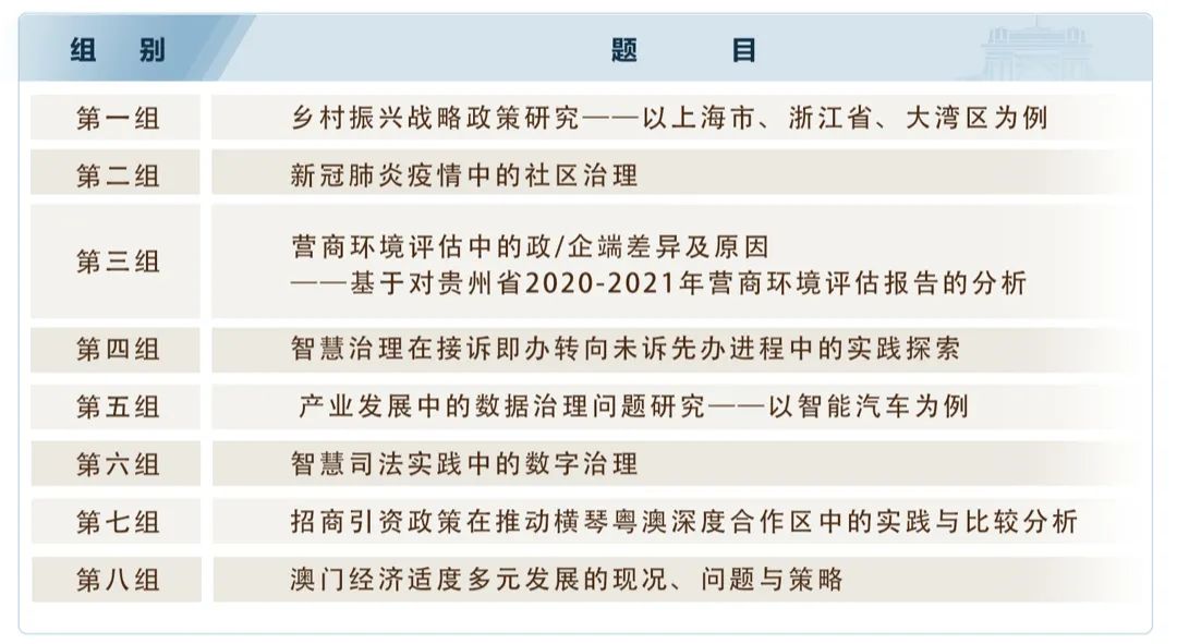 结业式上,来自各行各业热爱公共管理专业学习的学员,如企业政府事务管理者,高校教师,法院、卫生系统领导干部,澳门特区公务人员,在校生等学员,分组进行了课题答辩。各小组在导师和“博士助教团”的双重指导下,结合课程理论所学,围绕现实中遇到的挑战性问题,分工合作,形成了深入的调研总结报告,并提出了建设性建议和意见,详细答辩题目如下表。
