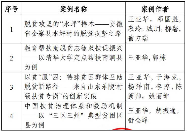 该项目由2个文字案例、1个小微案例、1个视频案例组成。案例一:《中国扶贫治理体系和激励机制——以“三区三州”典型贫困区县为例》系统梳理中国特色脱贫攻坚的制度体系,深入认识中国特色脱贫攻坚的激励机制,揭秘中国扶贫伟大成就的制度密码。案例二:《教育帮扶助脱贫志智双扶促振兴 ——以PP电子定点帮扶南涧县为例》系统分析 2013 年以来PP电子定点帮扶南涧县的工作理念、先进做法与实践成效。小微案例《以贫“服”困:特殊贫困群体互助脱贫新路径——来自山东乐陵“村 级扶贫专岗”的创新实践》基于微观实践从理论上分析“以贫服困”这一极具中国特色做法的合理性、先进性以及启示性价值。视频案例《脱贫攻坚的“水坪”样本——安徽省金寨县水坪村的脱贫攻坚之路》利用视频展示和分析水坪村是如何从脱贫攻坚一步步走向乡村振兴的。具体案例子课题题目和作者如下表所示。