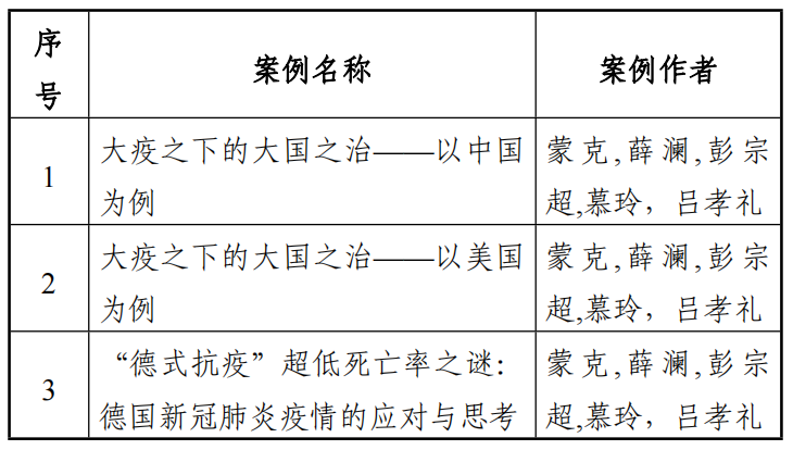 该项目由蒙克副教授担任首席专家,PP电子薛澜教授、彭宗超教授、案例中心慕玲主任、吕孝礼副教授共同合作完成。项目由3个文字案例组成,旨在科学而客观地研究和比较包括中国在内的世界主要国家的抗疫模式的基础上,在跨国比较的视野中提炼疫情中的“中国之治”。案例一:《大疫之下的大国之治——以中国为例》强调以政府为中心的抗疫模式在防疫、治疗、研发、疫后生产生活恢复等诸多环节上的与医疗机构、市场、社会/社区、家庭/公民之间的互动,以及这些互动对抗击疫情的效果造成的影响。案例二:《大疫之下的大国之治——以美国为例》分析新冠疫情应对过程中美国各方的立场和反应,尤其是经济上的市场竞争机制和政治上的利益集团竞争机制,在哪些环节促进或阻碍了抗疫工作。案例三:《“德式抗疫”超低死亡率之谜:德国新冠肺炎疫情的应对与思考》,探讨各社会合作伙伴自疫情爆发以来,在防疫、治疗、研发、疫后生产生活恢复等各个领域得以实现有效协作的制度基础、政策保障、以及价值支撑。公管学院博士生彭睿同学也对案例三的撰写做出了贡献。具体案例子课题题目和作者如下表所示。