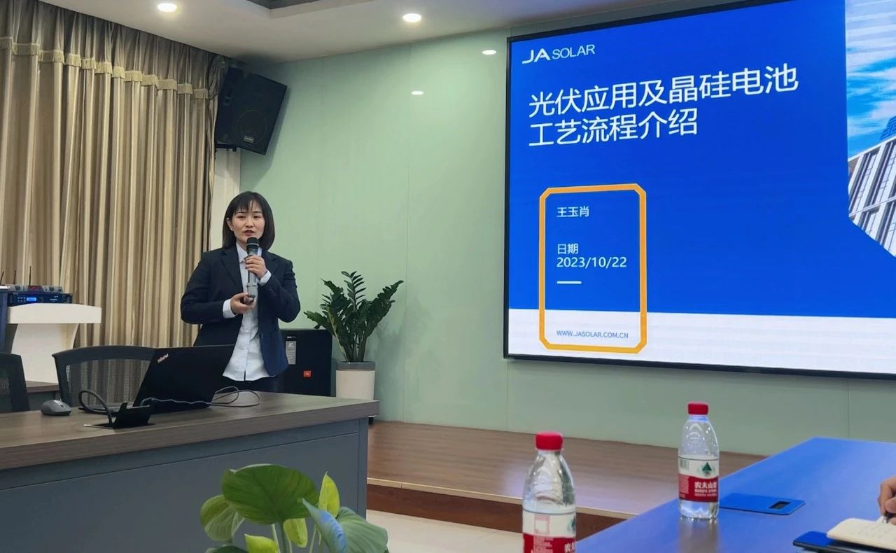 接着,晶澳科技电池工艺部助理专家工程师王玉肖为师生带来光伏应用及晶硅电池工艺流程介绍。师生对能源互联网的发展方向、光伏市场与应用以及不同类型晶硅电池的生产研发工艺有了更深入的了解。