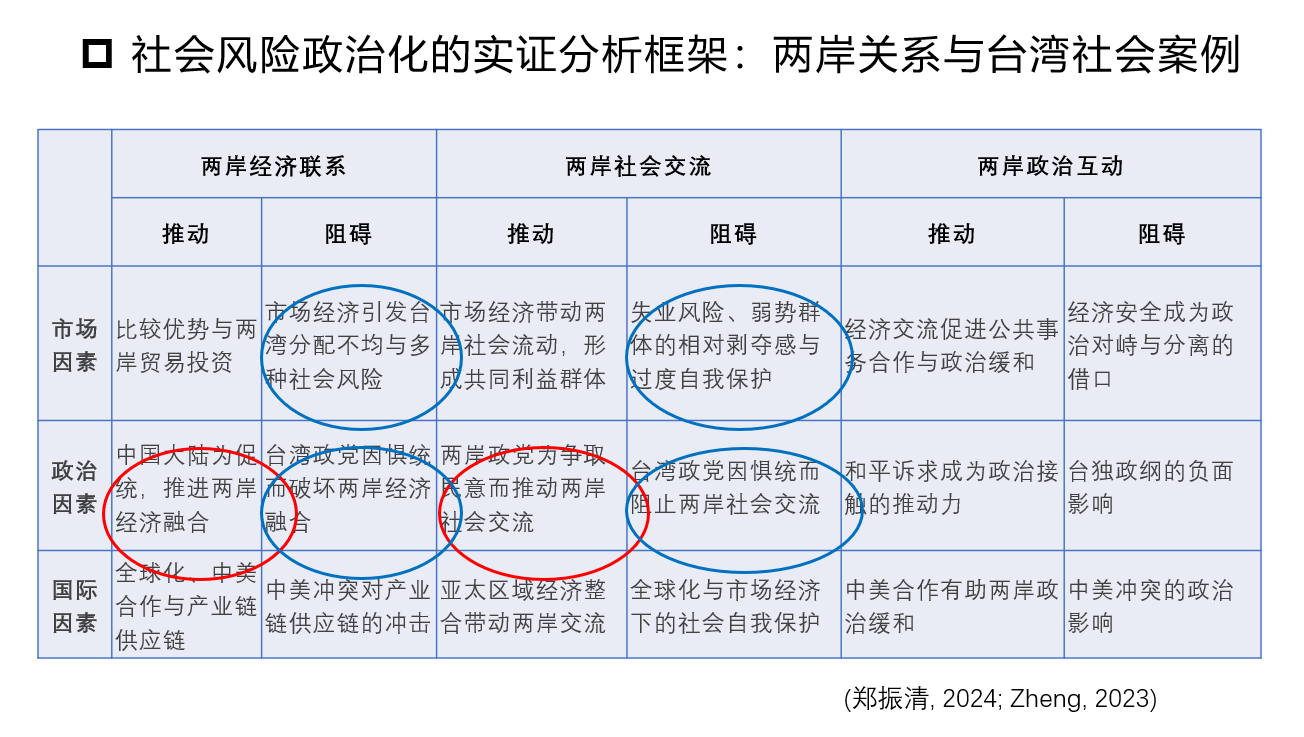 郑振清总结指出,亚太地区包括台湾在内的社会运动和社会风险的政治化,是在经济整合趋势和市场力量扩张的背景下,作为政治化机制的经济社会安全动员的结果。政党路线与安全论述、族群认同共同引发了社会风险的政治化。这是近年来世界各地“反全球化”与反对区域整合的共同的深层政治社会因素,在亚太政党政治的制度场景下尤为突出。揭示这些深层政社因素可以为各国各地区的经济社会政策提出改进的方向,促进更有包容性、更公平、更可持续的发展与治理之道。此外,这项学术研究及其理论讨论也为两岸经济社会关系的发展提出了政策参考。